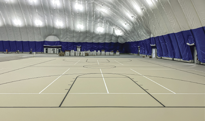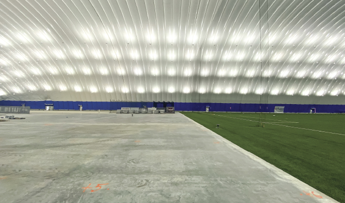 Few projects of this scale and function occur within an inflatable structure, and fewer still require such demanding flatness tolerances under those conditions. The project’s location inside an air-supported dome, along with the required performance-grade flooring tolerances, made this repair truly unique. The team had to develop a custom workflow that merged traditional leveling best practices with dynamic adaptation to the dome’s airflow, time constraints, and layout specifications.